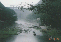 湯原ダムの堰堤の下の河原は湯気が立ちこめ、その片隅に無料の露天風呂が。