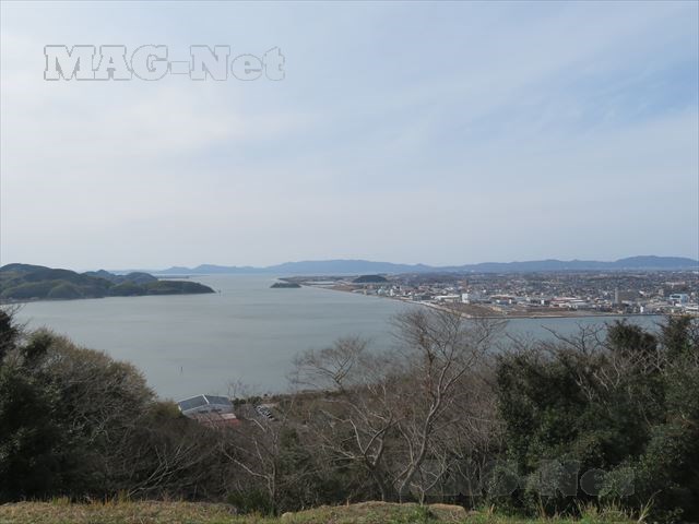 遠くに雪を被った大山の山々が、その手前には米子の町が広がっています。