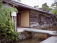 川沿いには長屋門があり、屋敷の中には橋を渡って入っていきます。