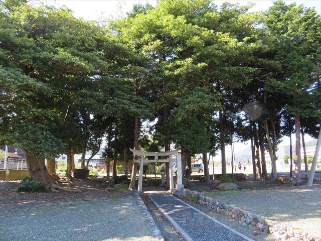 駅のそばには木々が茂った1角があり、鳥居が建っています。