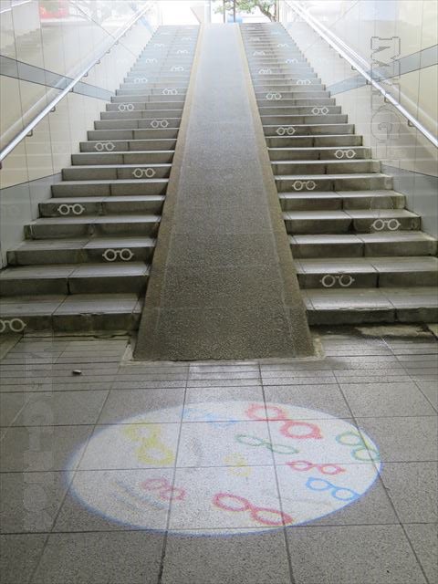 線路を潜る地下道は、階段にメガネの模様が浮かび上がっています。