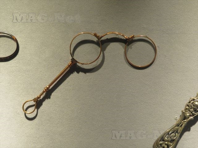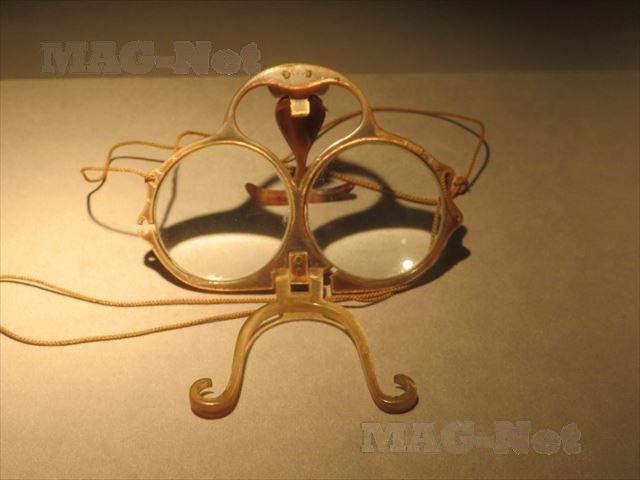 初期の金属フレームを加工したメガネ、それも耳にかけることなく装着できるものなど、貴重なメガネがここにはあります。