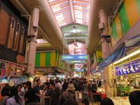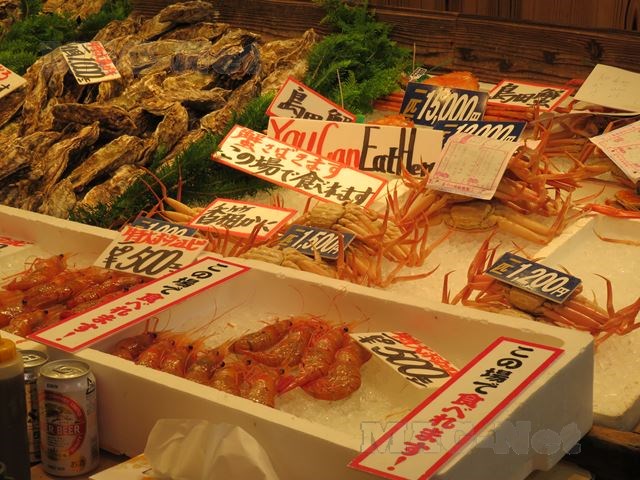 市場の通りは人でごったがえしており、新鮮な日本海の魚やそれを調理した食堂が並んでいます。