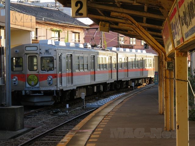 やってきたのは2両編成の鶴来行きの電車で、ステンレスのボディーにオレンジ色のラインが目印の元東急の車両です。