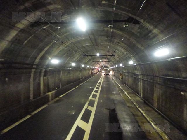 1車線だった道路もトンネルの中央部分では一時的に2車線に広がり、ここで反対方向から来たバスとすれ違います。