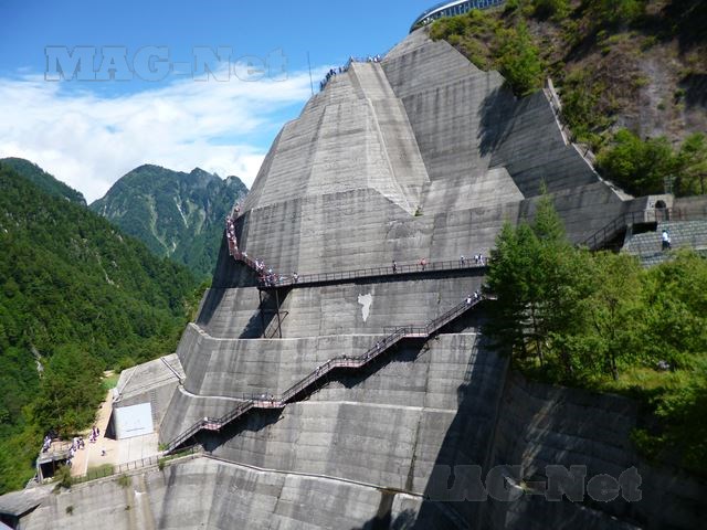 階段状の展望台からは、黒部湖がさらに小さく見えます。