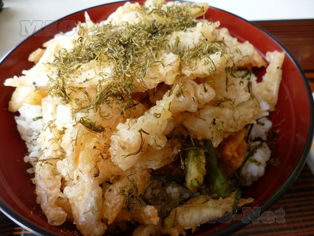 白エビとニンジン、インゲンのかき揚げに、甘いたれをかけて食べます。