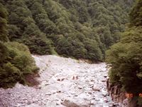 ゴツゴツした岩肌が並ぶところもあり、トロッコから木々の間を通して見える河原は、次第に険しいものになっていきます。