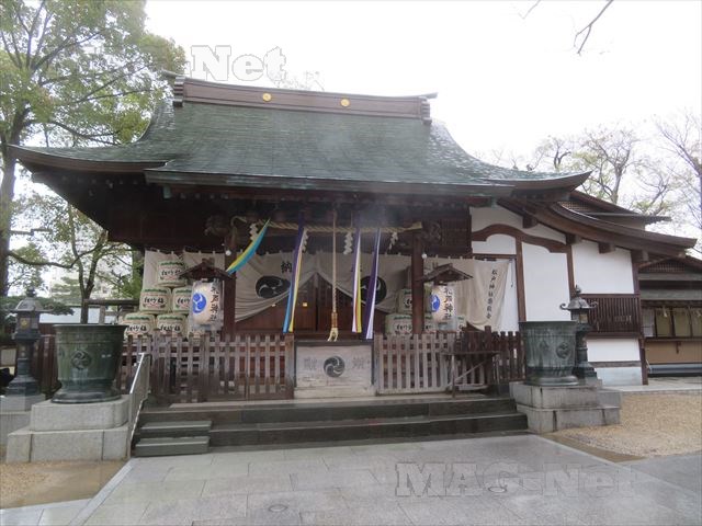 朱塗りの柱をもつ社殿で、そこに続く参道には88体の太子像が並んでいます。