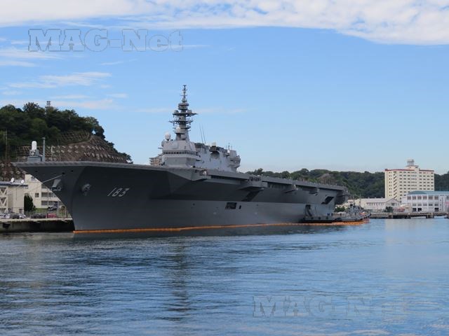 次に目の前に現れるのは183番を船体につけた自衛隊の護衛艦「いずも」で、ヘリコプターが搭載可能な船です。