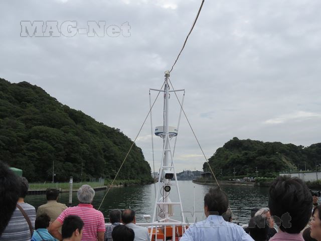 遊覧船は横須賀湾にできた島と本土との間を進みます。
