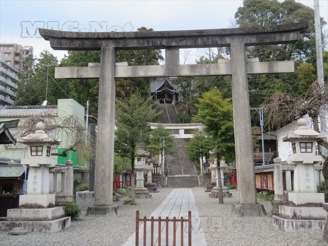 丘の上の拝殿に向かって長い石段が延びています。