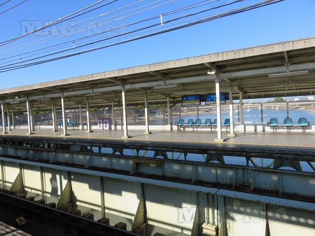 ホームからは武庫川の景色を見渡すことができ、線路の枕木の間からは川の流れが見えます。