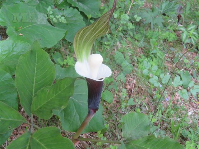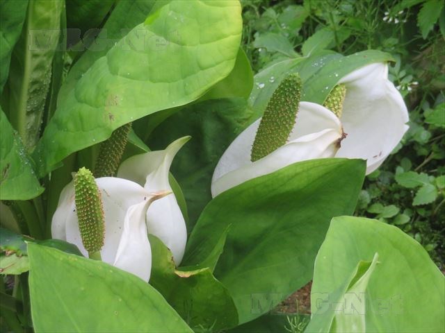 緑の中で目立つ白い特徴のある形の花は、普段見ることができない珍しいものです。