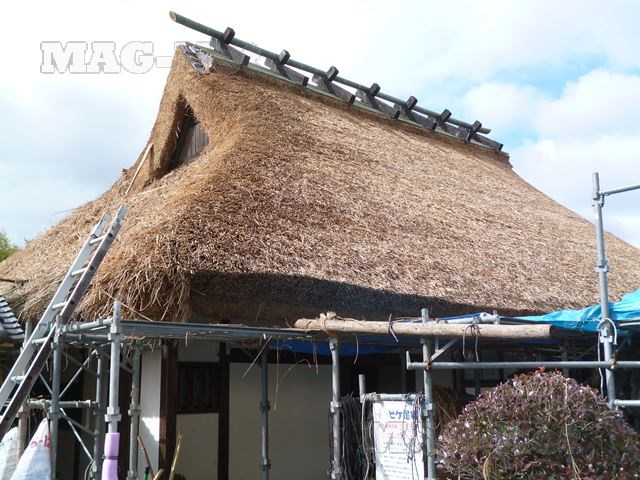 訪れた時は、おりしも屋根の吹き替え作業中。新たな色をした茅が次々と葺き替えられていきます。