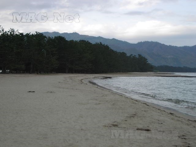 橋を渡るとその先は長々とした松並木で、その横は日本海に面する砂浜になっています。