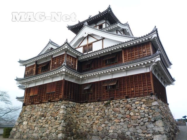 三重四階建ての大天守は、白壁で身を守る城とは見た目が違い、木材がむき出しの壁が目につきます。