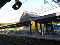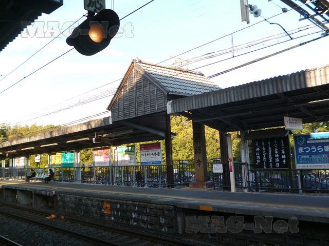駅のホームには「薬師寺」の石碑があり、それを瓦ぶきの屋根が守っています。
