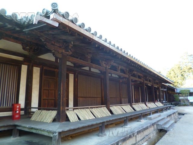 金堂から講堂方向には鼓楼と礼堂が並んでおり、礼堂には5月19日の「うちわ撒き」で使われるうちわの柄となる竹がびっしりと並べられ、乾かしています。