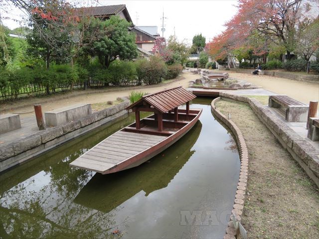 「水面迴廊」の端には三十石船が置かれ、水辺の散歩に最適の場所です。
