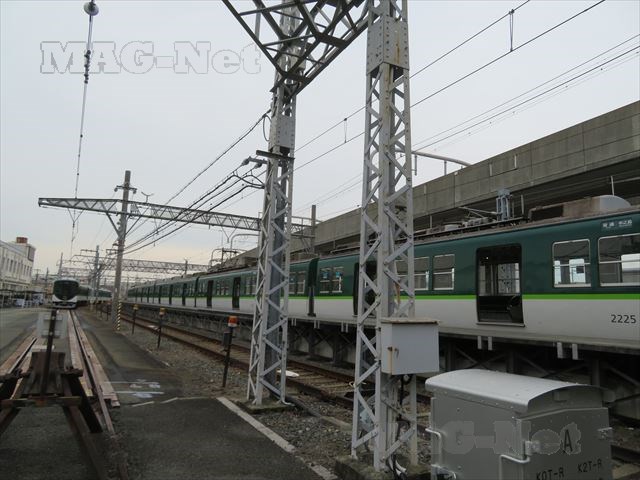 途中に京阪電車の車両基地があり、昼間でも時折電車の入線があります。