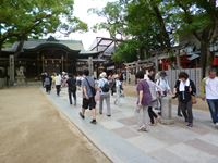 お百度参りで、神社入り口の百度石と本殿の間を行き来しています。