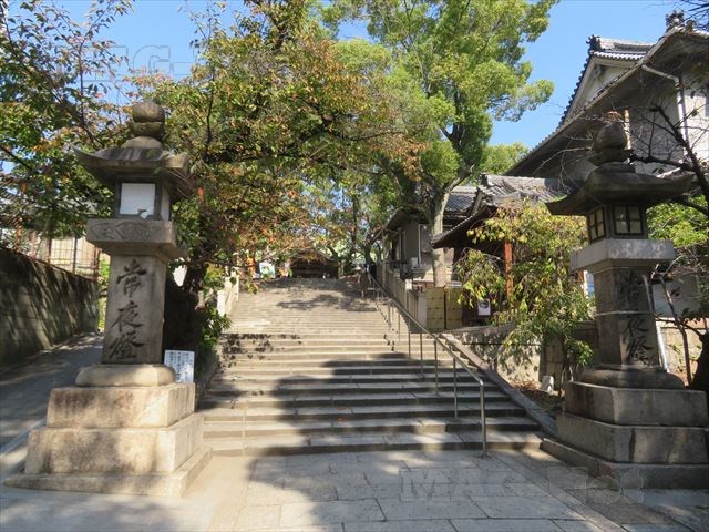 「榎木大明神」からは下りの石段となり、その先には東西に長堀通りが走っています。