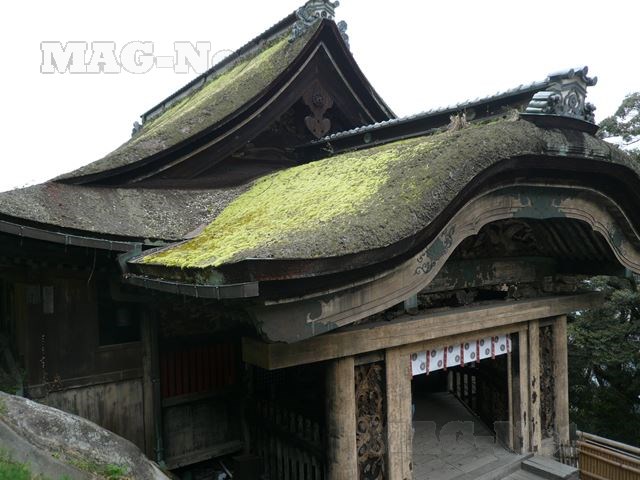 上から眺めると苔むした屋根が趣を感じさせる観音堂の唐門があります。