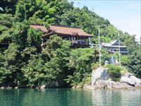 周囲2kmの竹生島には針葉樹林で覆われ、港以外は寺、神社の建物とそこに続く階段が見えるのみです。