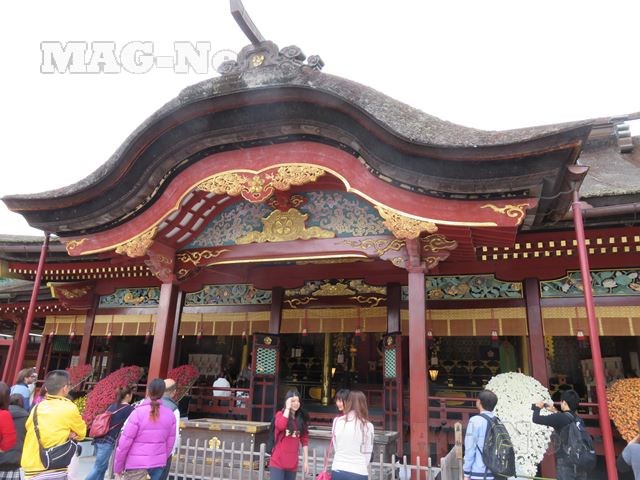 その先の朱色の櫻門を潜ると、目の前に境内が開け、奥には勇壮な本殿が見えてきます。