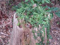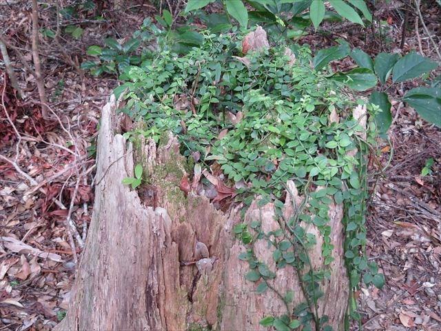朽ちた木の切り株には緑の草が生い茂り、まるで鉢植えを見ているようです。
