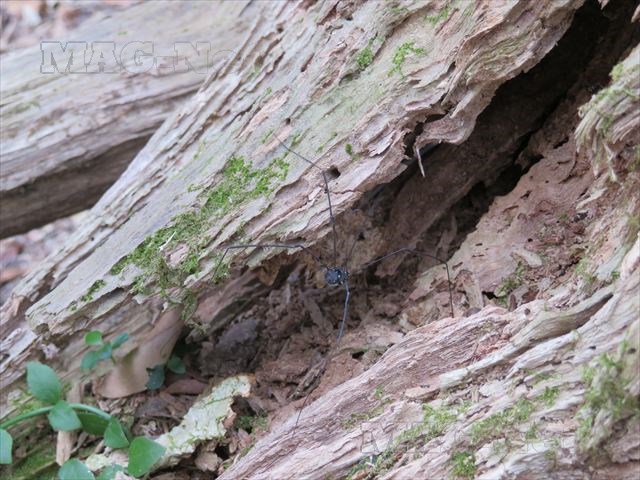 切株の根元に眼をやると、そこには細い「ザトウムシ」が移動しています。