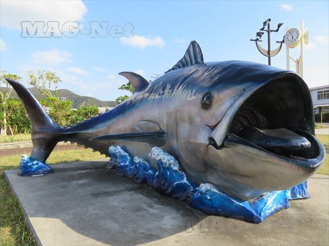 クロマグロ養殖日本一のモニュメントで、マグロが大きな口を開けています。