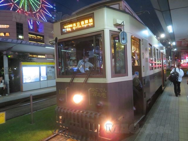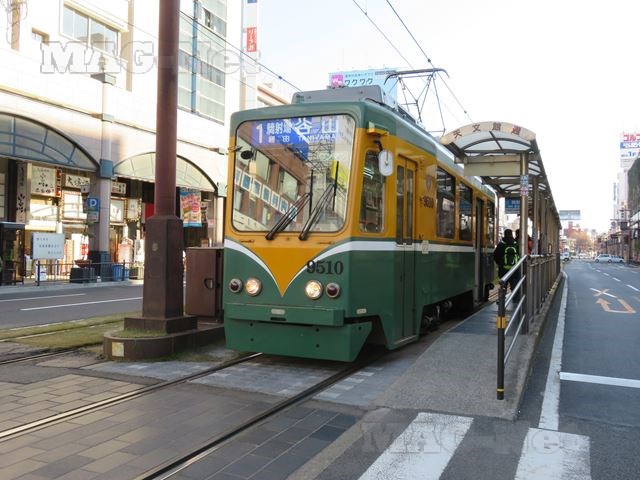 黄色と緑に塗られた車体が、鹿児島市電の標準色です。