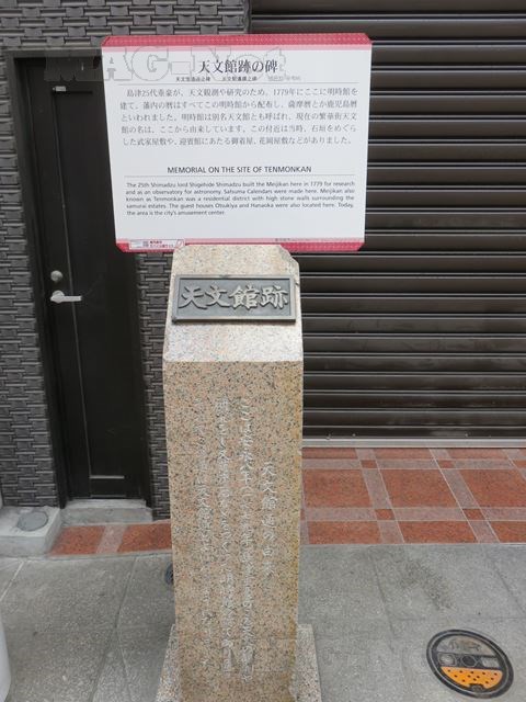 商店街には「天文館跡の碑」なるものがあり、それによれば島津第25代の重豪は天文観測のために1779年にこの地に「明時館」を建設します。