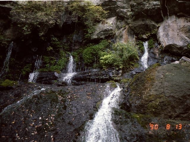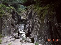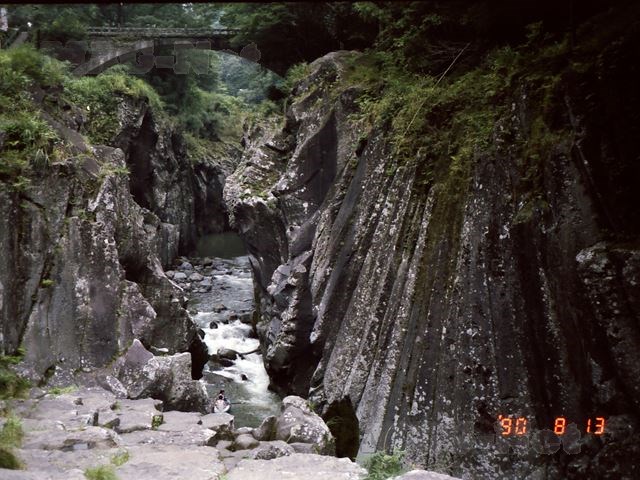 これは、約12万年前と9万年前の2回に渡る阿蘇火山活動の際に、噴出した溶岩流が五ヶ瀬川に沿って帯状に流れ出し急激に冷却されてできた侵食谷です。