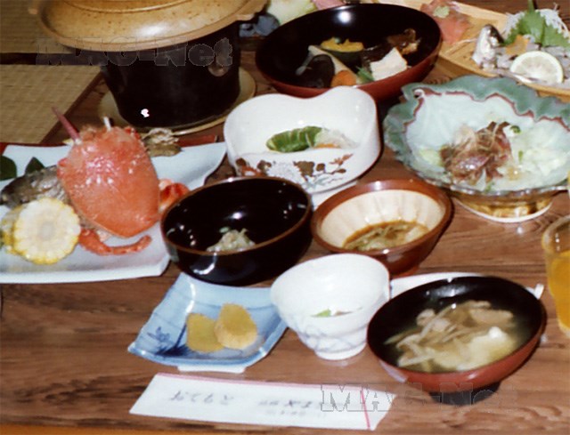 一方料理は、山菜、野菜、鮎とヤマメの川魚、それに縦長の旭カニなど、鍋や刺身や焼物の腹いっぱいのおもてなしで、大満足でした。