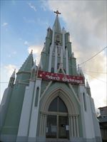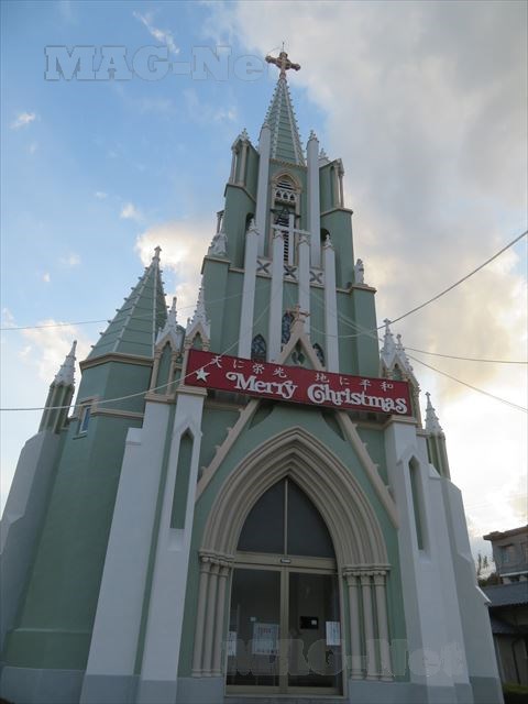 の尖鋭な屋根と十字架が目印の黄緑色の綺麗な教会です。