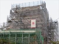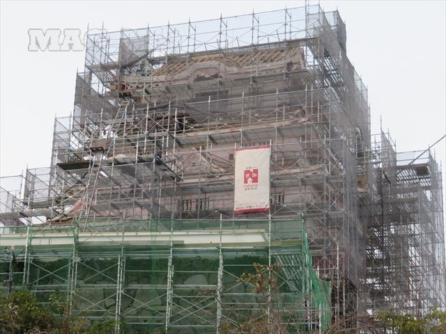 ただし工事用のシートで覆われ、工事用の足場の隙間からかろうじて城の形が判別できるくらいです。