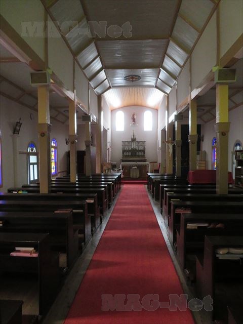 家庭的な教会で、祭壇には地元の信者が製作した聖母像が祀られています。