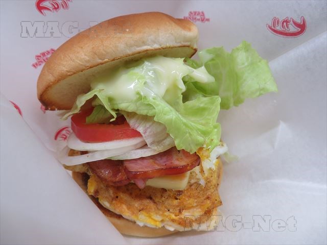 ハンバーグ、卵、レタス、タマネギ、ベーコンなどの具だくさんのハンバーガに、ドレッシングと濃いめのソースが掛かっています。
