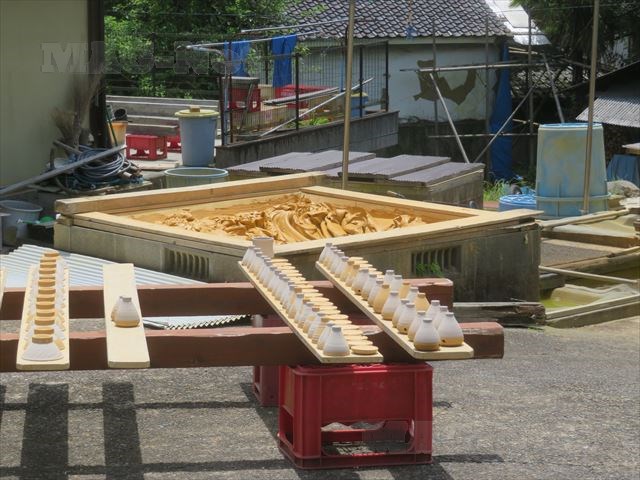 敷地内にはろくろで形を整えたばかりの茶碗が並べられ、天日干しの最中です。