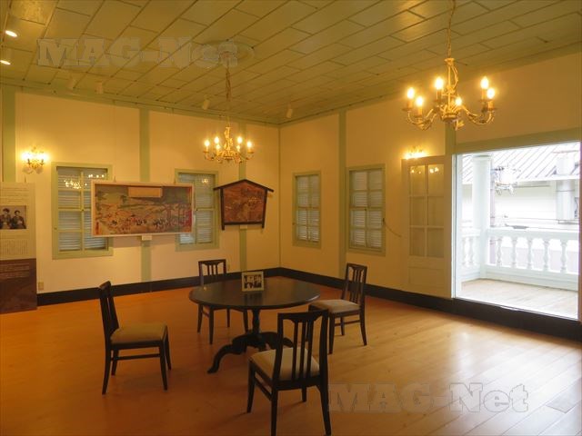 2階建ての建物の内部を見学することができ、バルコニーを有しシャンデリアが灯る洋室があります。