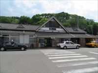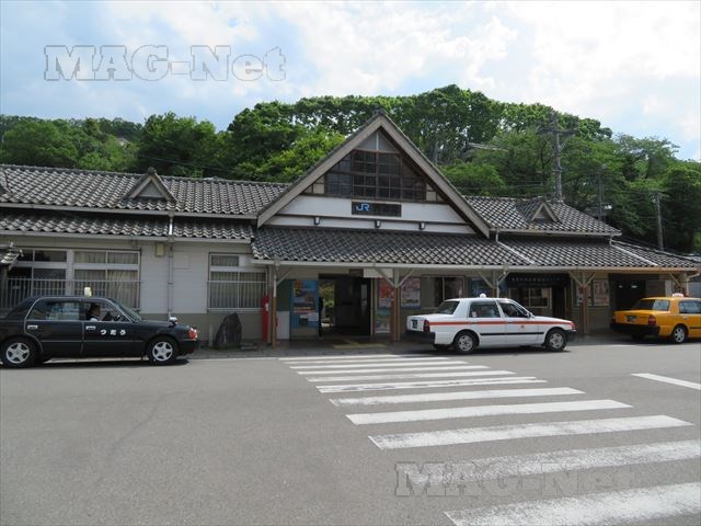 瓦屋根の駅舎前の広場には、数台のタクシーが並んでいます。