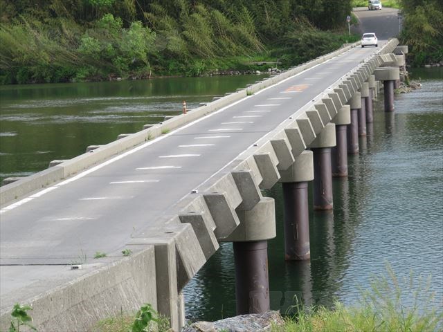 欄干がない潜水橋は、大雨による川の流れで橋が流されないようにしたものです。