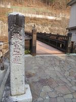 道路脇の崖の上から道路に屋根のひさしが張り出している「西方寺」を通って、車も通ることができる「行人橋」辺りまでやってきます。