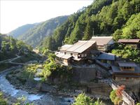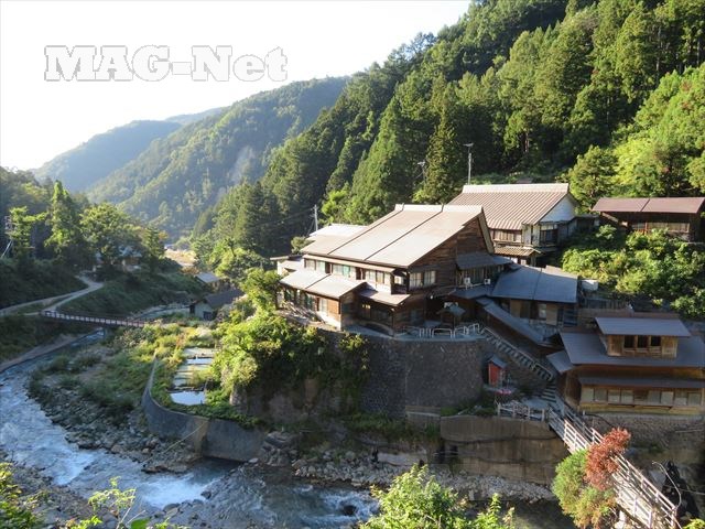 しばらくすると視界が開け、横湯川の対岸に温泉宿が見えます。