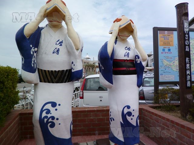 バスターミナルから出たところには、この地方の踊りである「佐渡おけさ」の像が建っています。