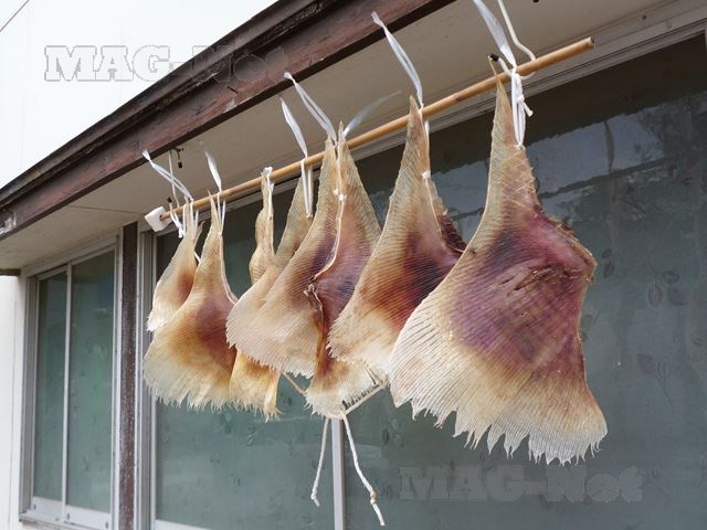 内陸側に進んでいくと、軒下に魚のヒレのようなものが干されています。