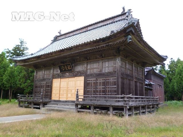 両側を狛犬に守られながら、社殿の屋根の中央が前方に張り出す向拝がないところは、佐渡の一般的な様式のようです。